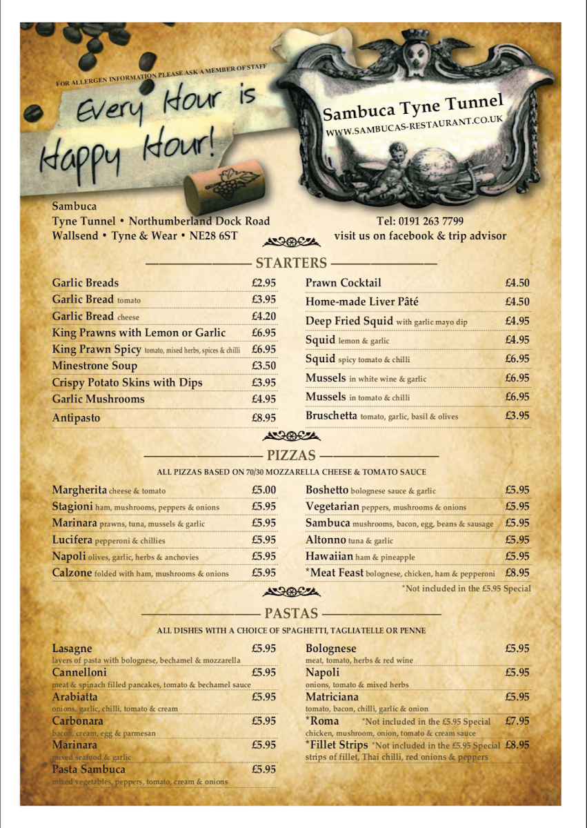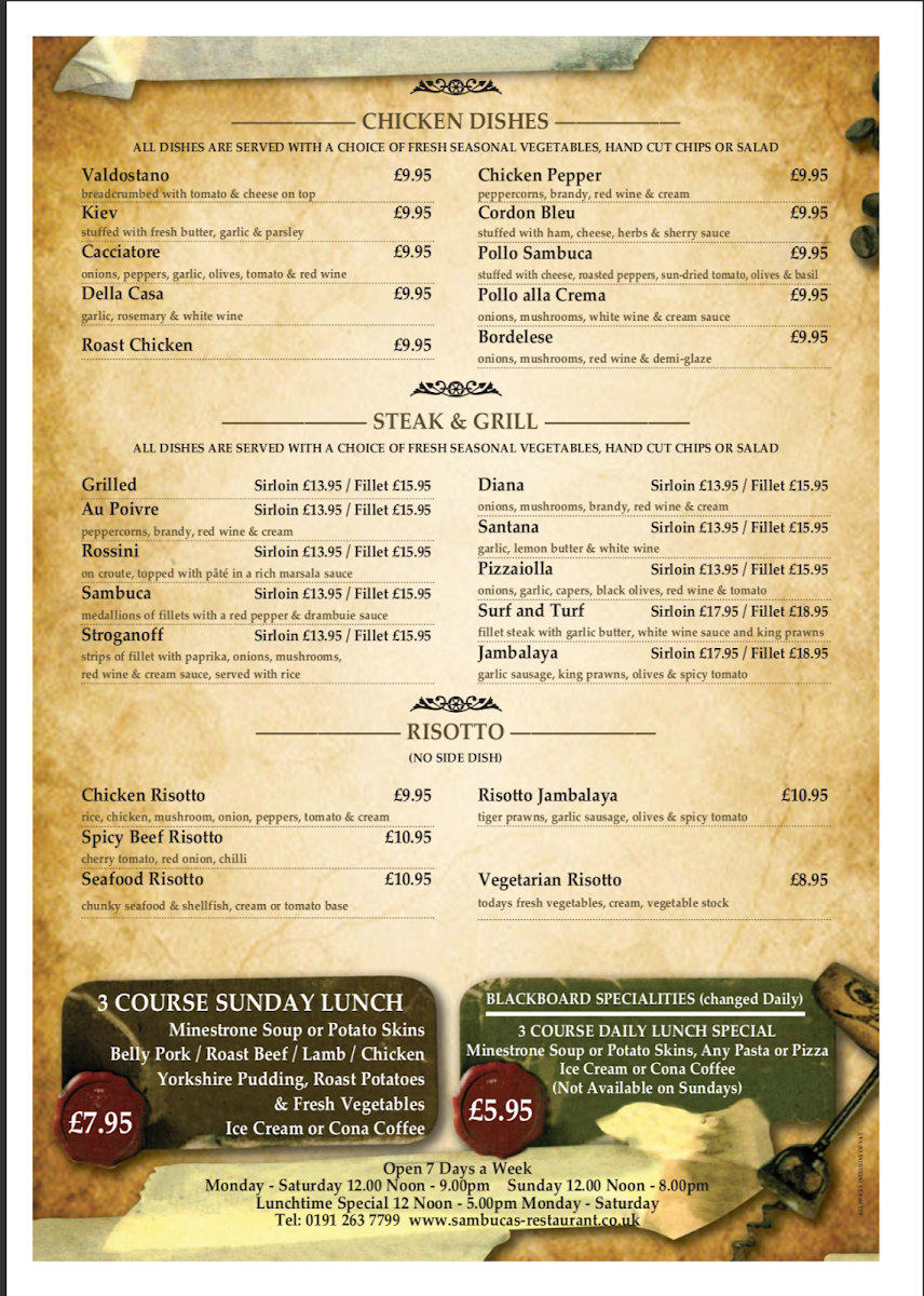 Sambuca - Tyne Tunnel is a vibrant Italian restaurant nestled in the heart of Wallsend, offering an impressive range of authentic dishes perfect for pizza delivery or takeaway. The menu shines with rich, flavorful options like Chicken, Spicy Beef, Seafood, and Vegetarian Risottos, each crafted to deliver a comforting yet refined taste experience. Their New Style Chargrilled Steaks are standout highlights, featuring exquisite varieties such as Au Poivre, Rossini, Stroganoff, and Surf and Turf that showcase a masterful blend of Italian tradition and bold seasoning.
